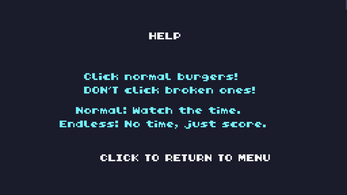 Oyunda ekranda rastgele hamburgerler beliriyor. İyi hamburgerlere bastığınızda puan kazanıyor ve zaman ekleniyor, kötü hamburgerlerden ise uzak durmanız gerekiyor. Ayrıca oyunda buz ve altın hamburgerler gibi özel hamburgerler de bulunuyor; bunlar en yüksek puanı elde etmenize yardımcı oluyor.